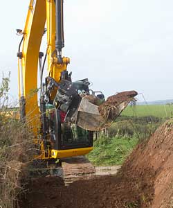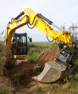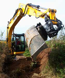 TiltrotatorsIn Scandanavia 90% of diggers and excavators are equipped with tiltrotators. They are making there way across Europe and America but in the UK are still rare. We had one of the first to be fitted in the South West and it needed an engineer to come accross from Sweden to fit. There are several different makes available but we decided on Kinshofer Tiltrotator - Nox TR14. A tiltrotator is mounted on the excavator such that the excavator bucket can be rotated through 360 degrees and one tilts +/- 50 degrees, in order to increase the flexibility and precision of the excavator. A tiltrotator can best be described as a wrist between the arm of the excavator and bucket, (or whatever other tool is fitted to the tiltrotator's quick coupler). With its integral quick coupler and rotary swivel, the tiltrotator can also use extra hydraulic functions to power and manipulate other worktools below it such as tree shears, grapple or an concrete crusher, which can be attached to the quickcoupler on the tiltrotator, for simplified attachment mounting, dramatically increasing the excavator's utilization on the jobsite. Control systems which allows the operator to operate the machine fully through the joysticks. After using it for a couple of weeks Shaun said he would never do back to excavator without one. |