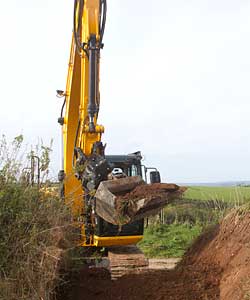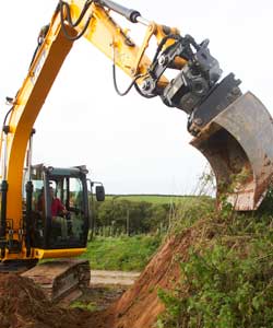 TiltrotatorsIn Scandanavia 90% of diggers and excavators are equipped with tiltrotators. They are making there way across Europe and America but in the UK are still rare. We had one of the first to be fitted in the South West and it needed an engineer to come accross from Sweden to fit. There are several different makes available but we decided on Kinshofer Tiltrotator - Nox TR14. A tiltrotator is mounted on the excavator such that the excavator bucket can be rotated through 360 degrees and one tilts +/- 50 degrees, in order to increase the flexibility and precision of the excavator. A tiltrotator can best be described as a wrist between the arm of the excavator and bucket, (or whatever other tool is fitted to the tiltrotator's quick coupler). With its integral quick coupler and rotary swivel, the tiltrotator can also use extra hydraulic functions to power and manipulate other worktools below it such as tree shears, grapple or an concrete crusher, which can be attached to the quickcoupler on the tiltrotator, for simplified attachment mounting, dramatically increasing the excavator's utilization on the jobsite. Control systems which allows the operator to operate the machine fully through the joysticks. After using it for a couple of weeks Shaun said he would never do back to excavator without one. |